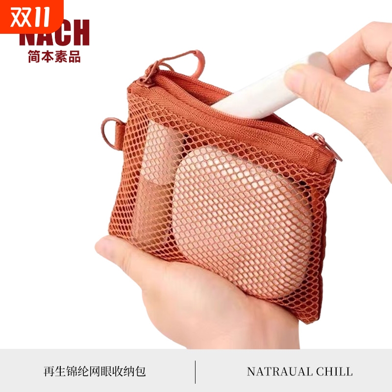 简本素品日本网纱再生聚酯纤维双拉链包网格收纳袋旅行便携零钱包