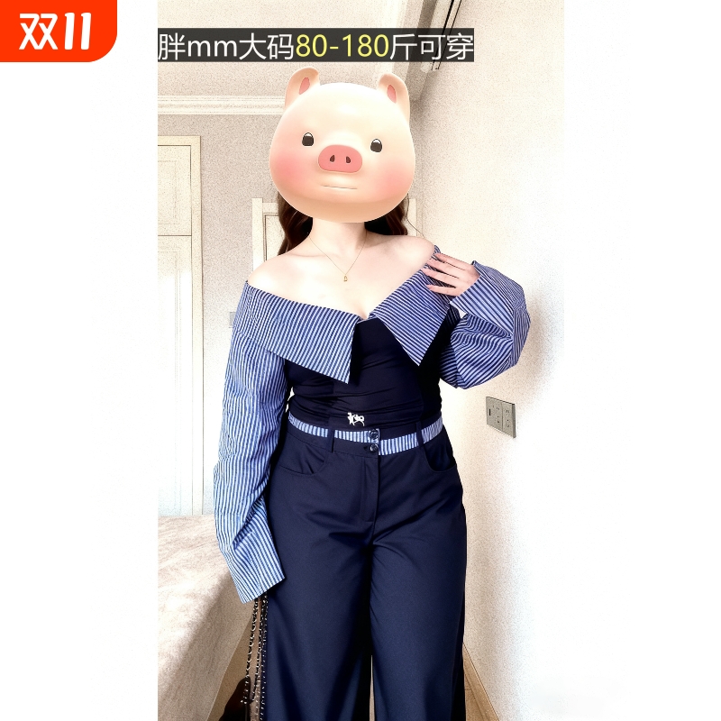 设计感一字肩条纹拼接衬衫上衣女春季高腰阔腿裤两件套大码气质潮