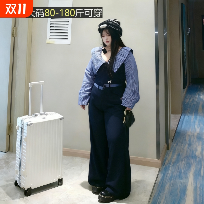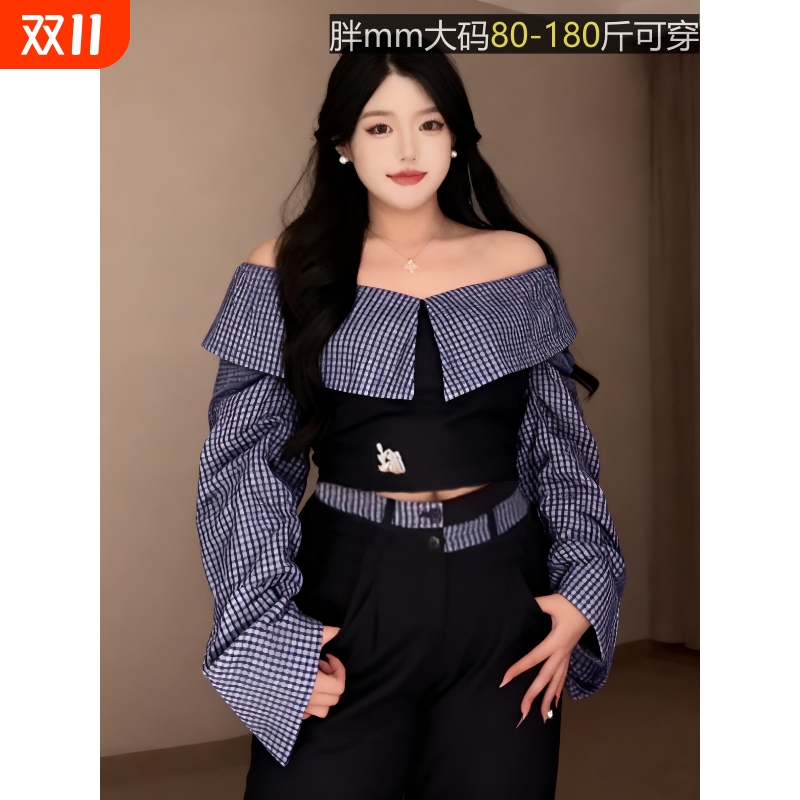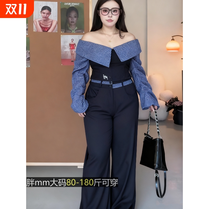 一字肩拼接显瘦修身上衣学院风大码胖mm女休闲阔腿长裤两件套秋季