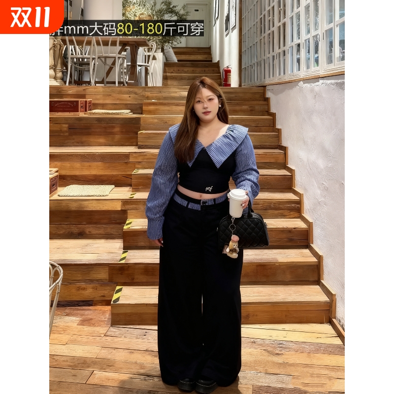 大码气质潮设计感一字肩条纹拼接衬衫上衣女春季高腰阔腿裤两件套