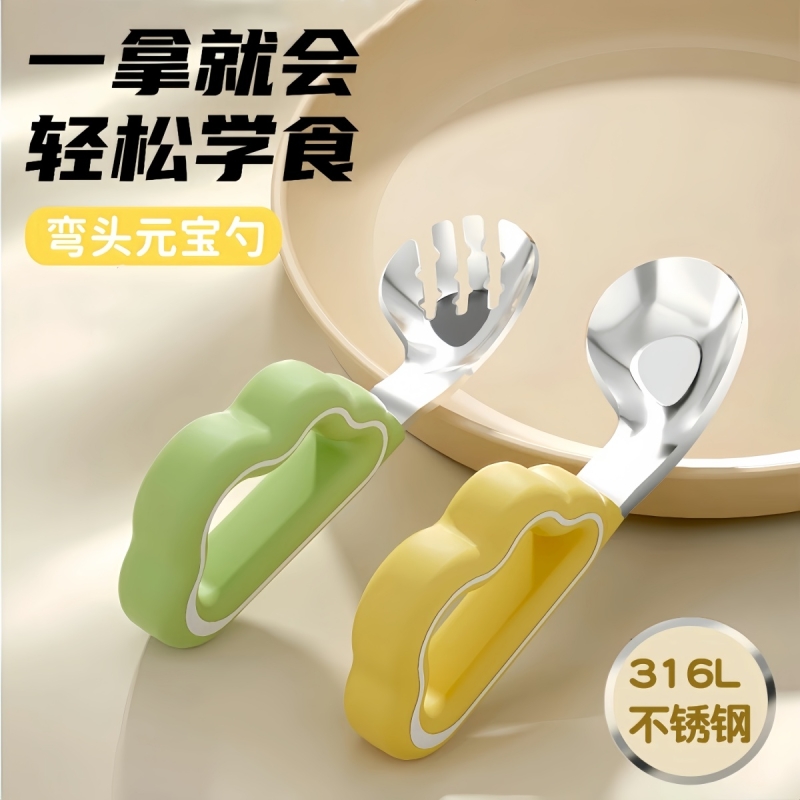 儿童勺子自主进食宝宝叉勺学吃训练吃饭专用餐具316L不锈钢元宝勺