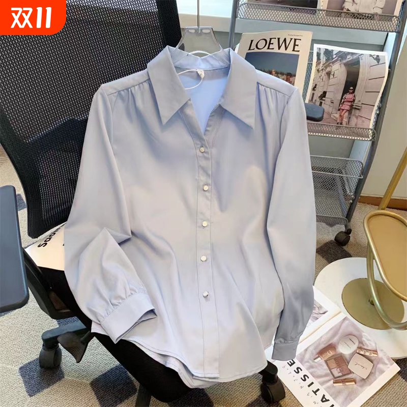 春秋季v领蓝色衬衫女长袖通勤修身大码职业正装销售工作服白衬衣