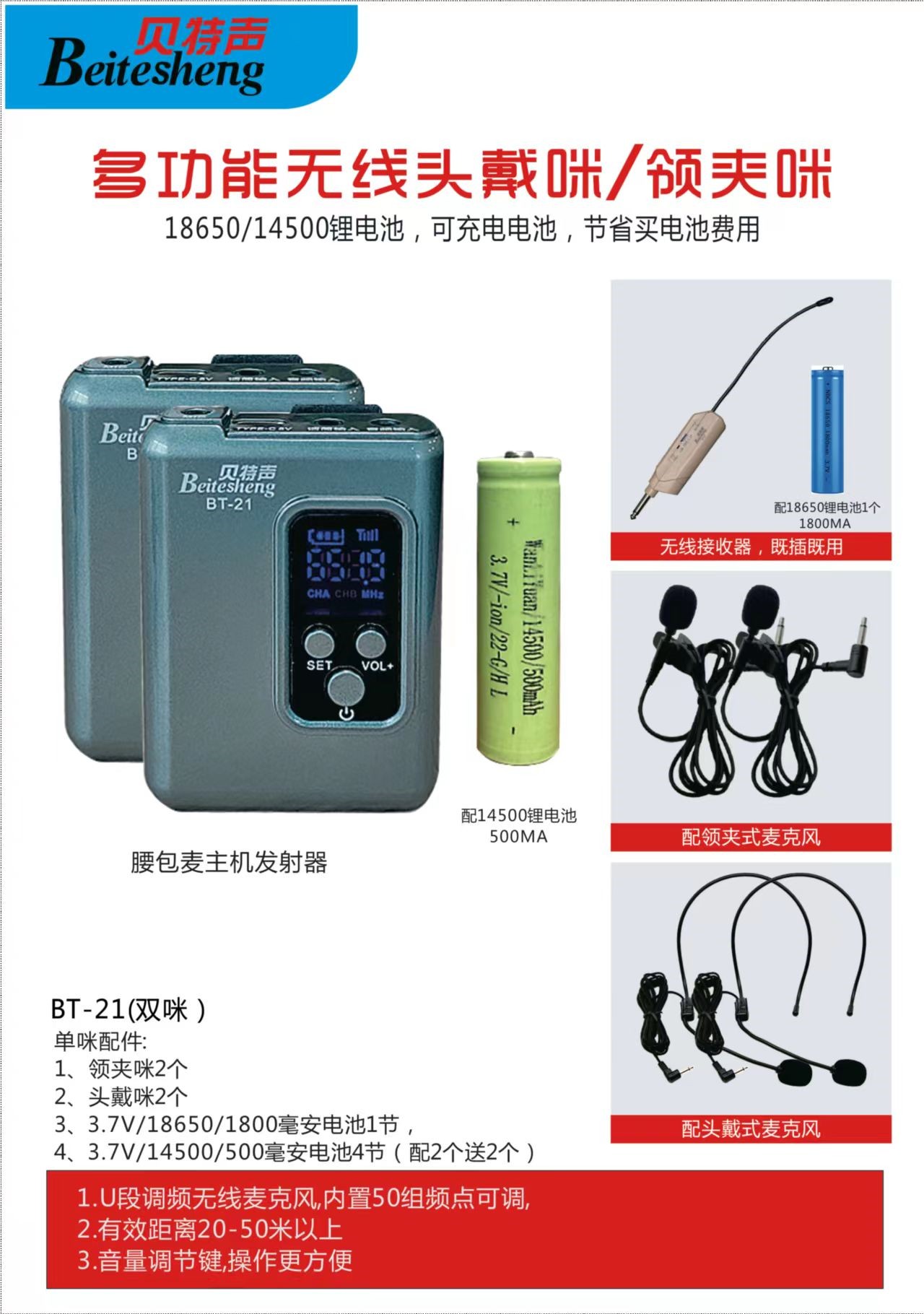 贝特声新款BT20 BT21手持话筒腰挎方麦领夹头戴舞台K歌户外