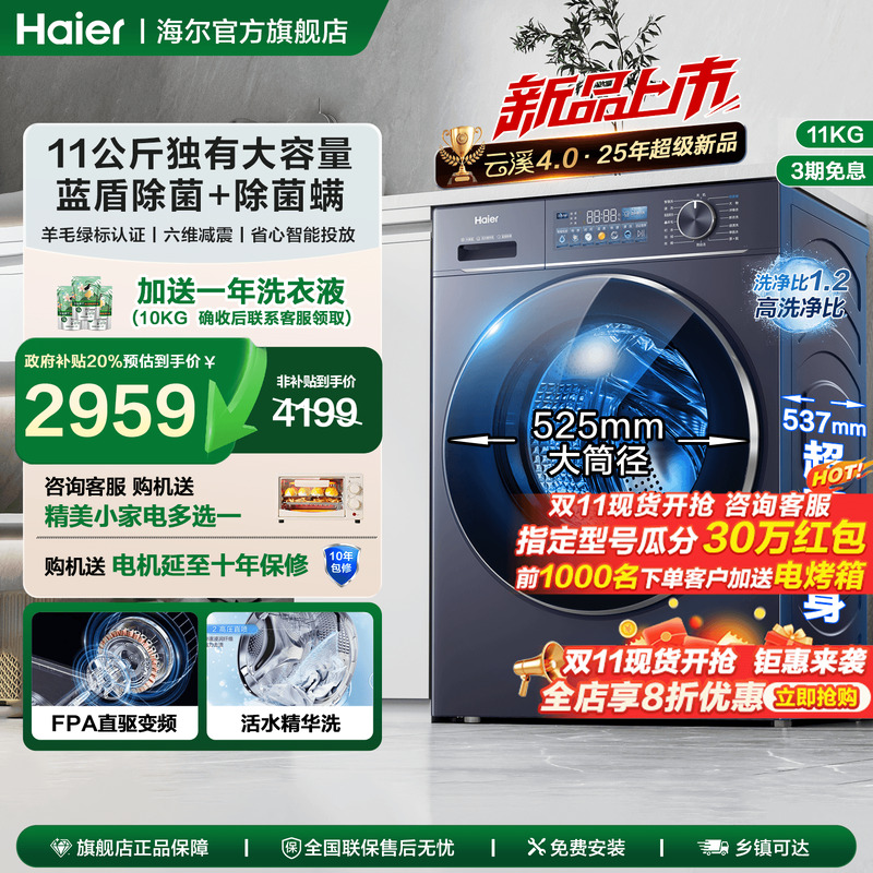 【立减20%】海尔超薄全自动变频家用滚筒洗衣机11公斤大容量58