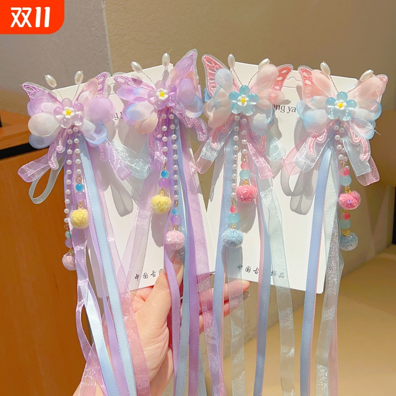 中国风儿童汉服头饰小女孩古风飘带发夹超仙蝴蝶流苏编发古装发饰