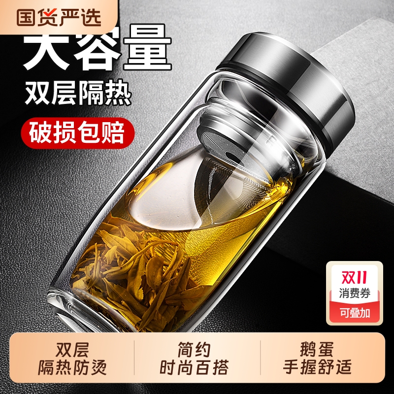 玻璃杯水杯双层杯子男鹅蛋泡茶杯茶水分离加厚大容量喝茶高硼硅
