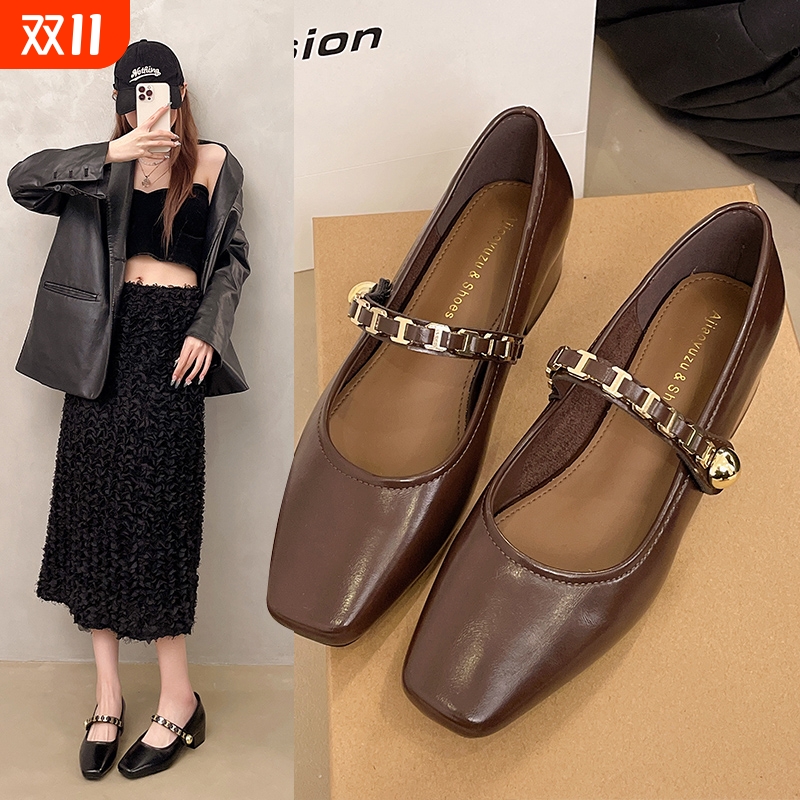 法式复古方头玛丽珍鞋女春时尚链条粗跟浅口单鞋百搭一字带小皮鞋