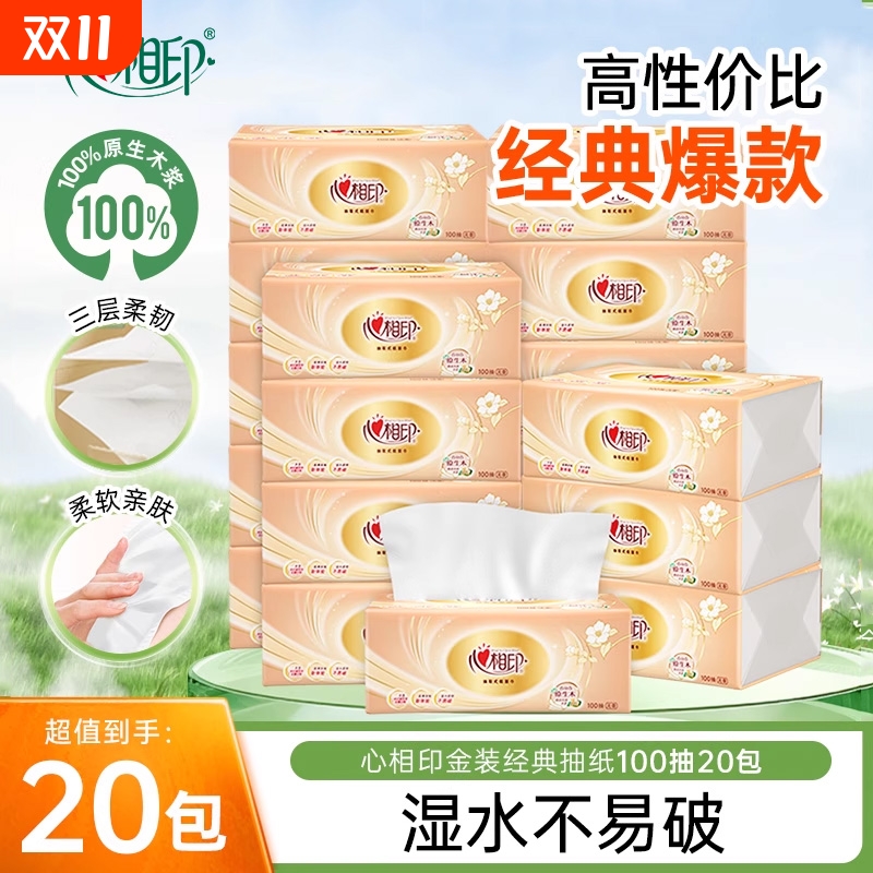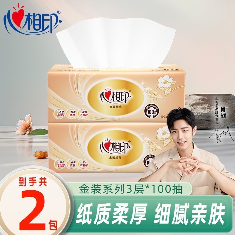 心相印金装经典抽纸3层100抽可湿水餐巾纸卫生纸家用纸抽木浆原生