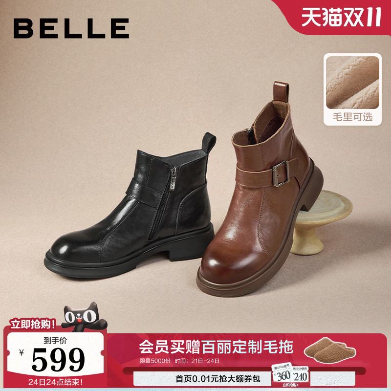 百丽靴子英伦风冬季新款粗高跟羊皮短靴加绒厚底马丁靴3NW40DD