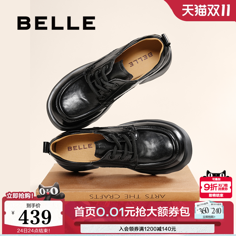 百丽复古牛津鞋女2025新款厚底粗跟黑色深口小皮单鞋子B2791