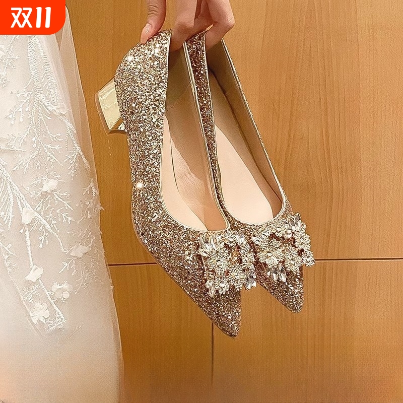 法式水晶花婚鞋女秀禾婚纱两穿不累脚新娘鞋低跟亮片单鞋日常可穿