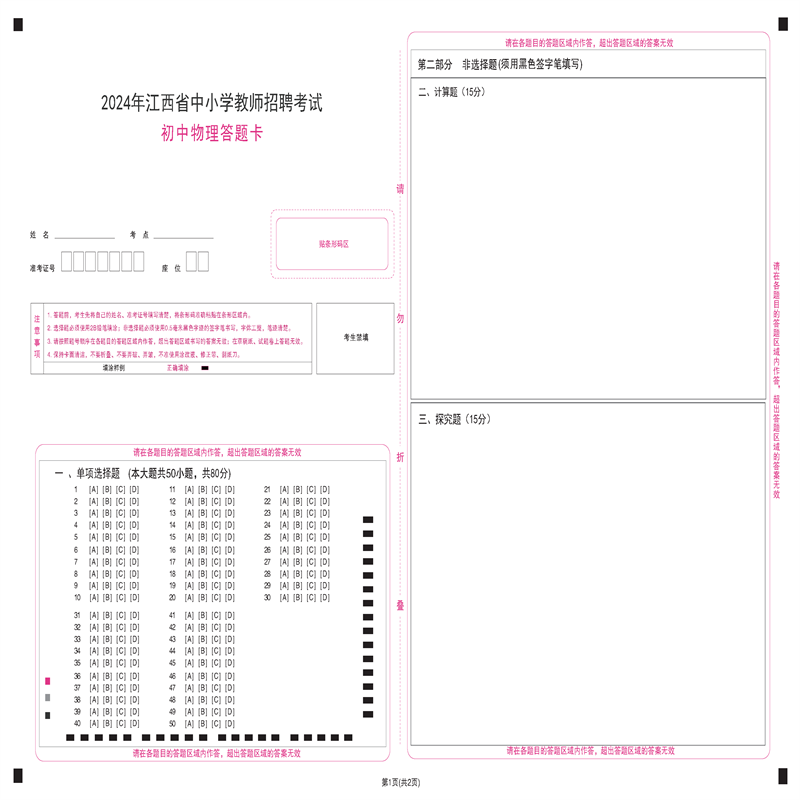 2024江西省教师招聘考试高中英语模拟答题卡A3双面媲美考试纸张