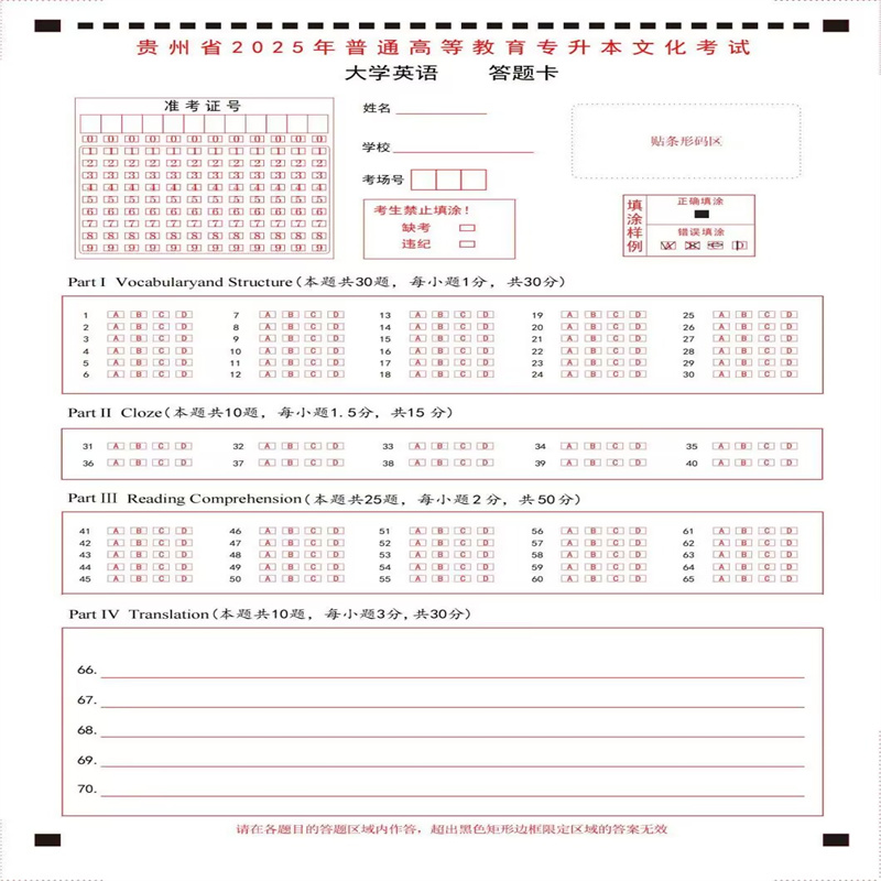 2025年贵州省普通高等教育专升本英语模拟答题卡A4双面120克
