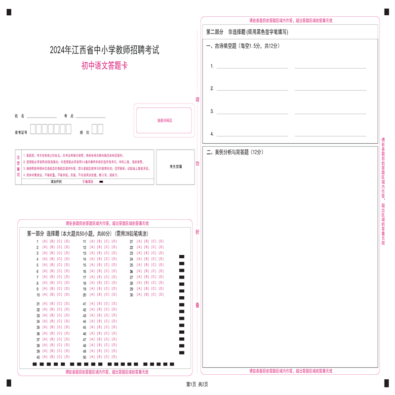2024年江西省教师招聘考试高中语文模拟答题卡A3双面媲美考试纸
