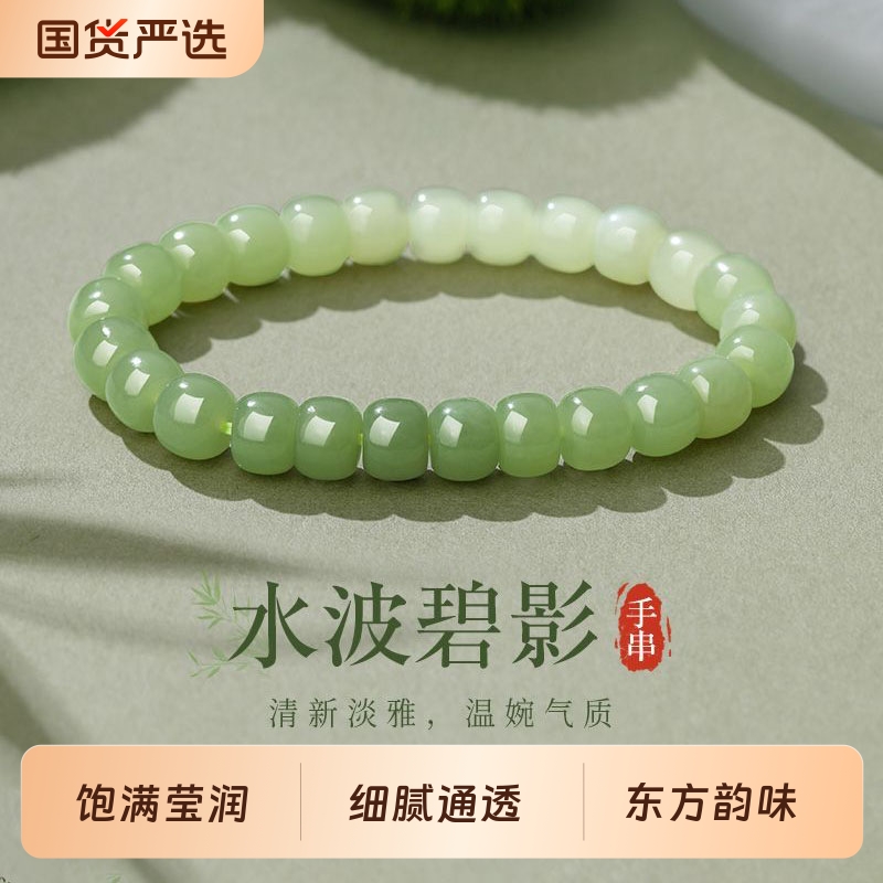 老型珠天然和田玉渐变手串新中式国风女手链桶珠正品玉石素圈手链