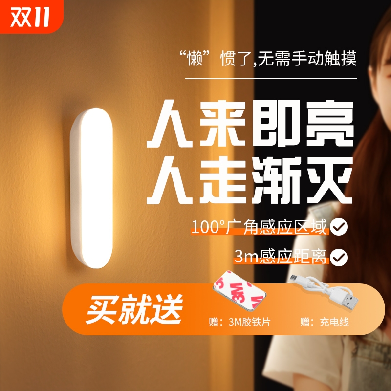 智能人体感应灯小夜灯充电床头起夜入户厕所人来即亮台灯夜间宿舍