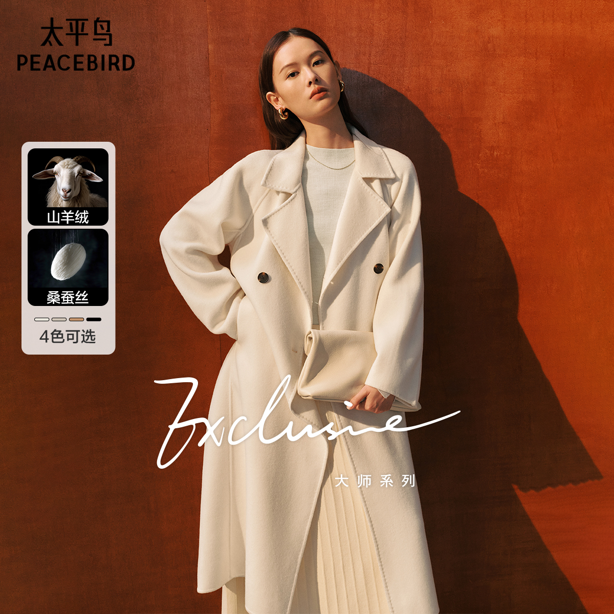 太平鸟大师甄绒系列西西里浴袍羊绒大衣女双面毛呢款白色赫本风