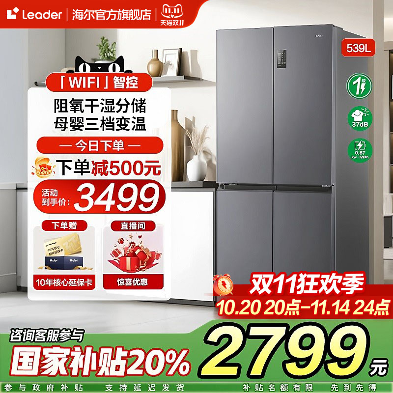 海尔统帅539L冰箱十字对开四门大容量家用一级风冷无霜官方旗舰店