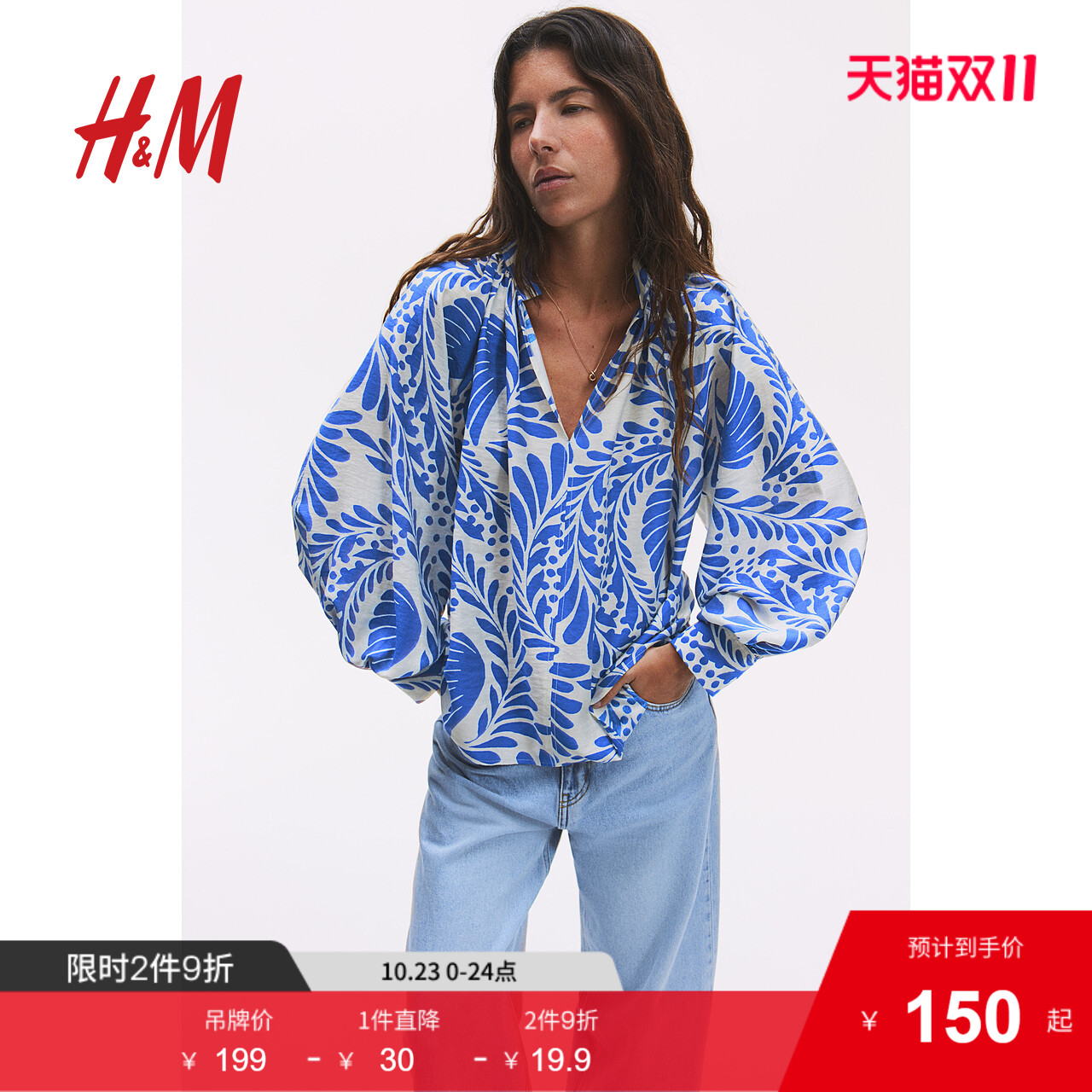 HM女装衬衫秋季条纹V领灯笼袖大廓形法式气质长袖上衣125881