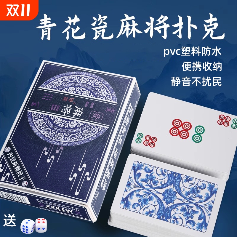 麻将扑克牌防水可水洗麻将牌家用纸牌144张旅行简装加厚小号色子