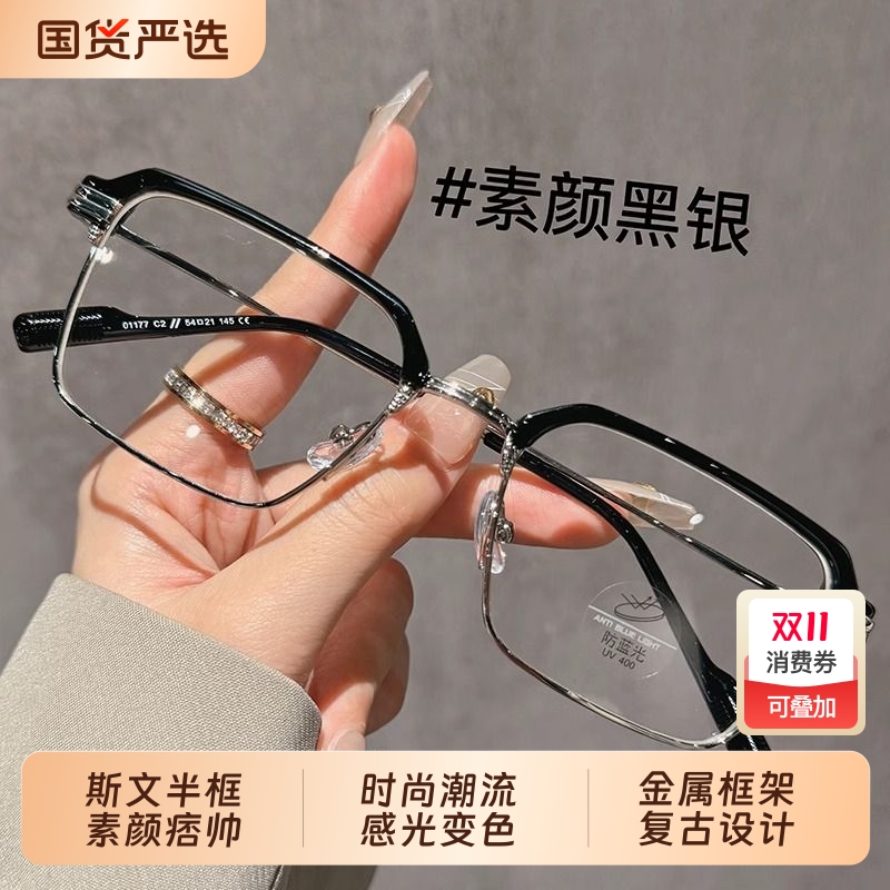 感光男女防蓝光辐射抗疲劳平光眼镜半框护眼防近视无度数变色两用