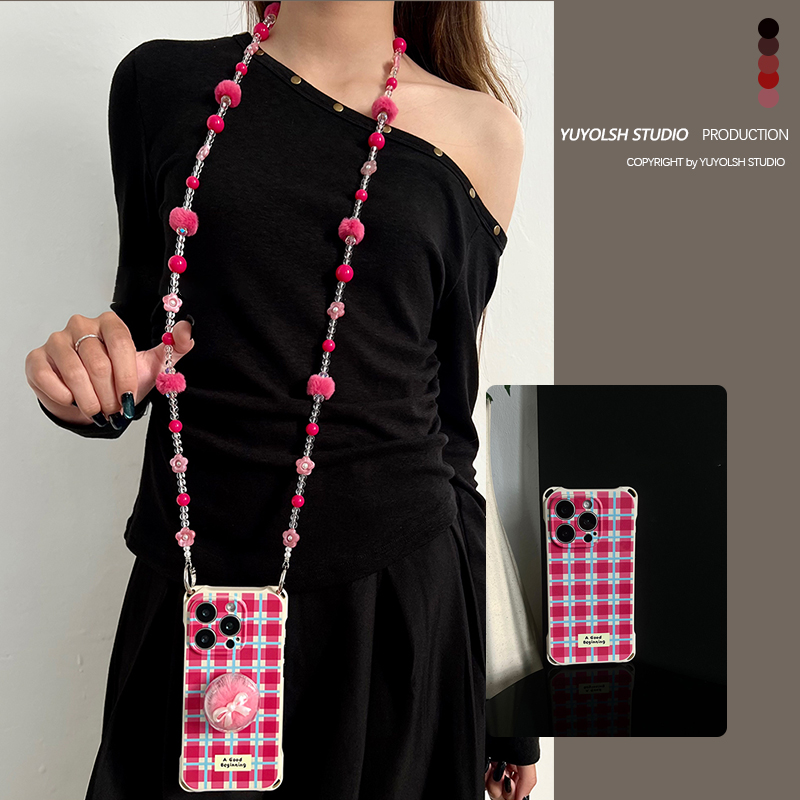 粉蓝格纹支架手机壳斜挎手提挂链