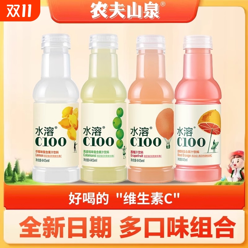 农夫山泉水溶C100饮料每日维生素C柠檬血橙445ml5瓶果汁柚