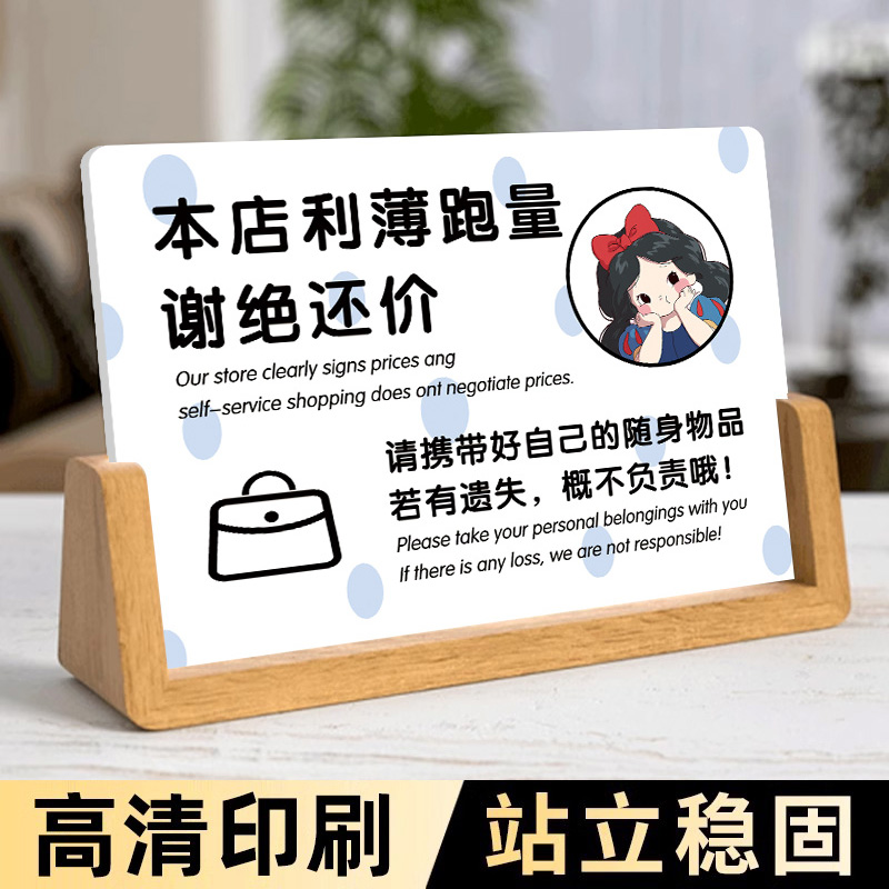 谢绝还价提示牌服装店提示牌摆台概不赊账本店利薄不讲价牌子明码标价