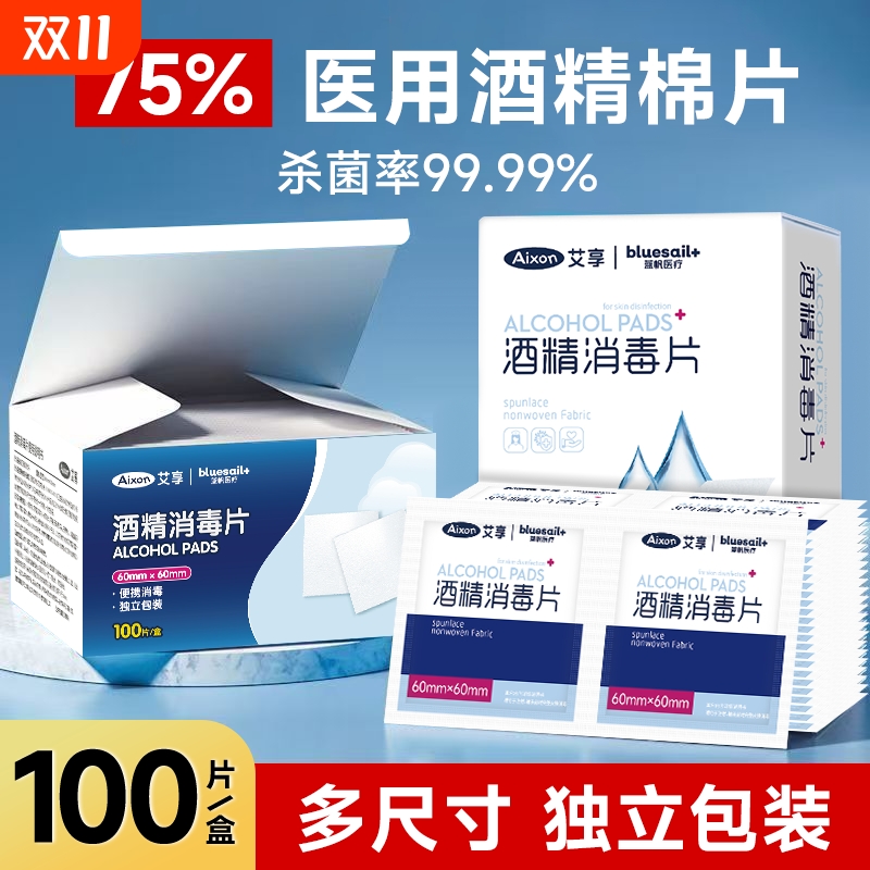 100片 艾享医用酒精消毒棉片75度一次性酒精湿巾耳洞单独包装湿