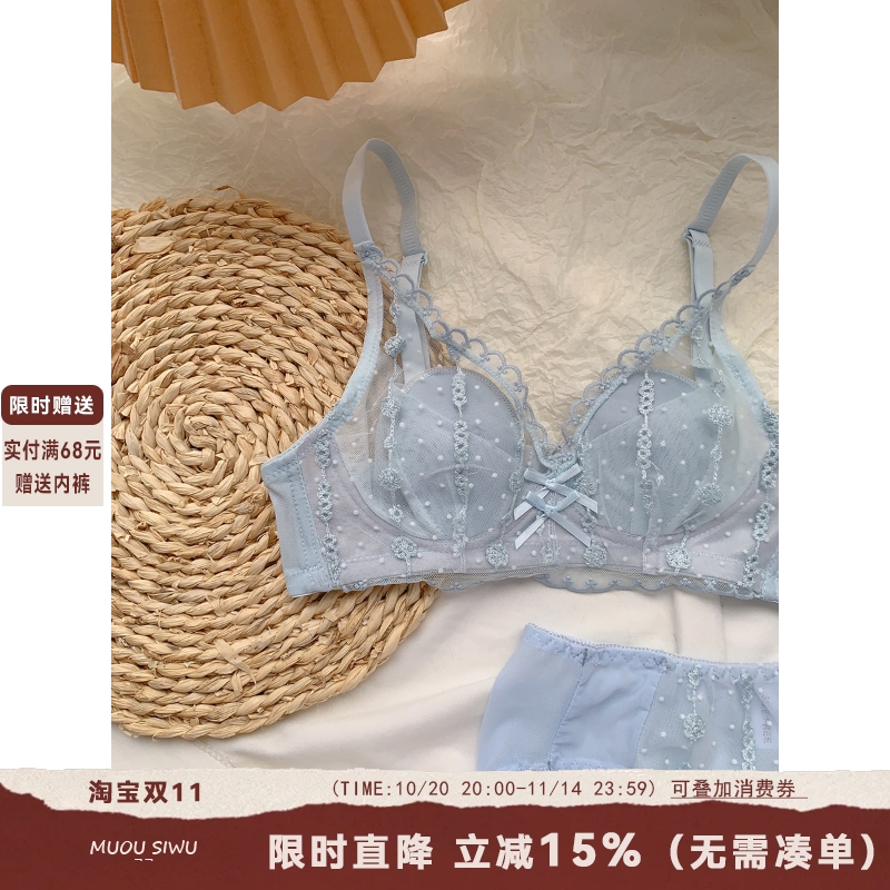 日系甜美可爱蕾丝内衣少女蓝色无钢圈小胸聚拢性感纯欲风文胸套装