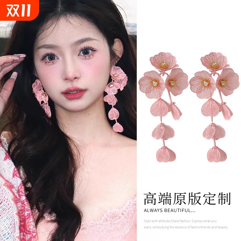 新中式粉色花朵流苏耳环夸张耳钉轻奢高级感耳坠新娘耳饰女无耳洞