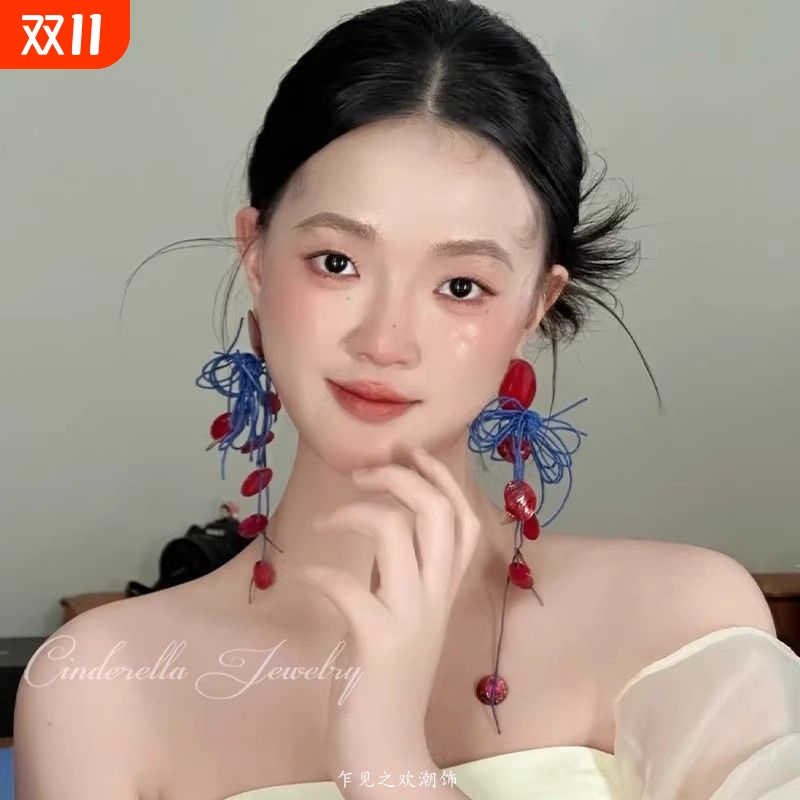 新娘新中式红蓝撞色耳环复古秀禾耳饰高级感旗袍礼服结婚耳坠水滴