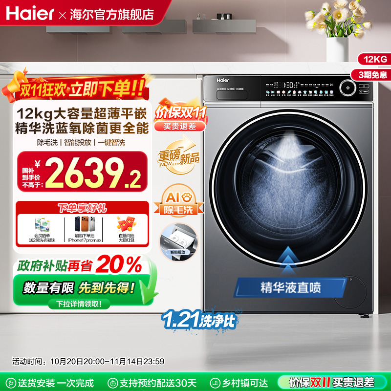 [以旧换新]海尔滚筒洗衣机12公斤家用全自动大容量精华洗超薄65