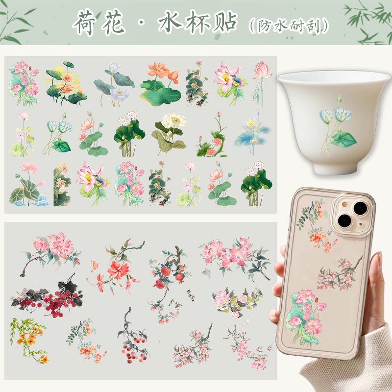 杯子贴纸防水防热古风荷花花朵水杯UV水晶标透明保温杯