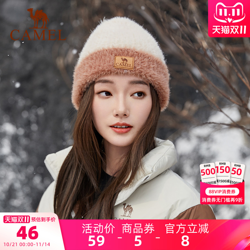 骆驼仿貂毛拼色针织帽2025新款秋冬季女保暖防风护耳大头围毛线帽