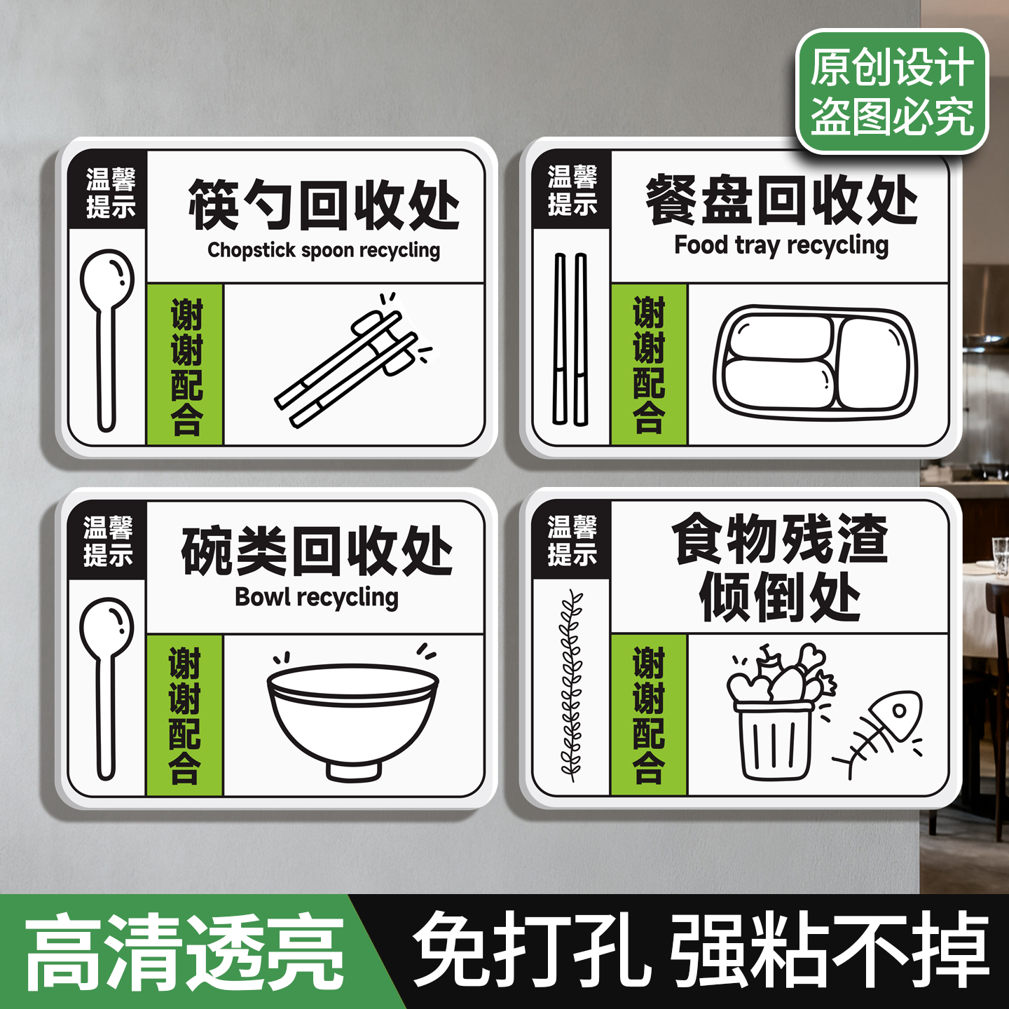 亚克力提示牌食堂自助餐具筷勺碗类回收处食物残渣倾倒处谢谢配合