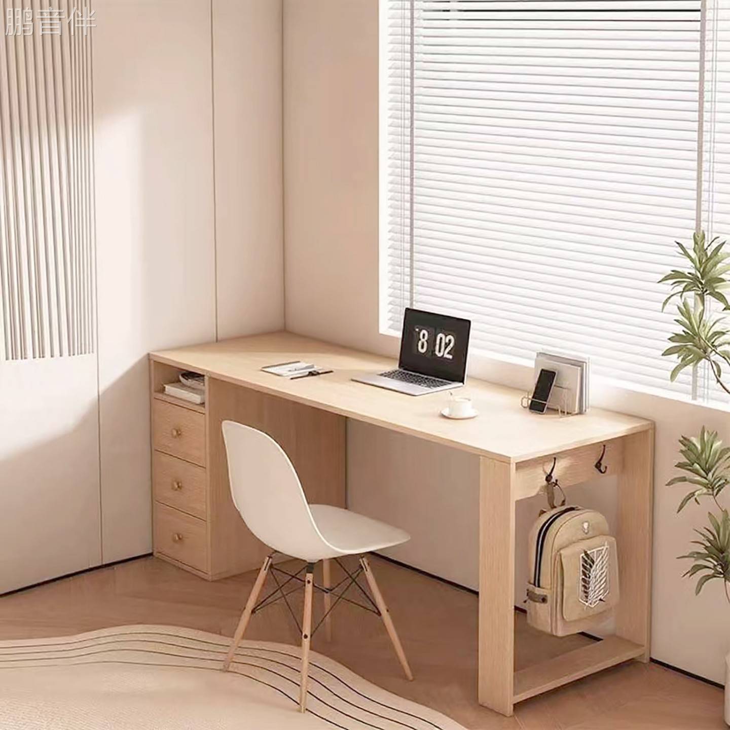 鹏音伴简约实木书 桌 书 架 一体组合带抽屉置物 柜 家用靠墙学