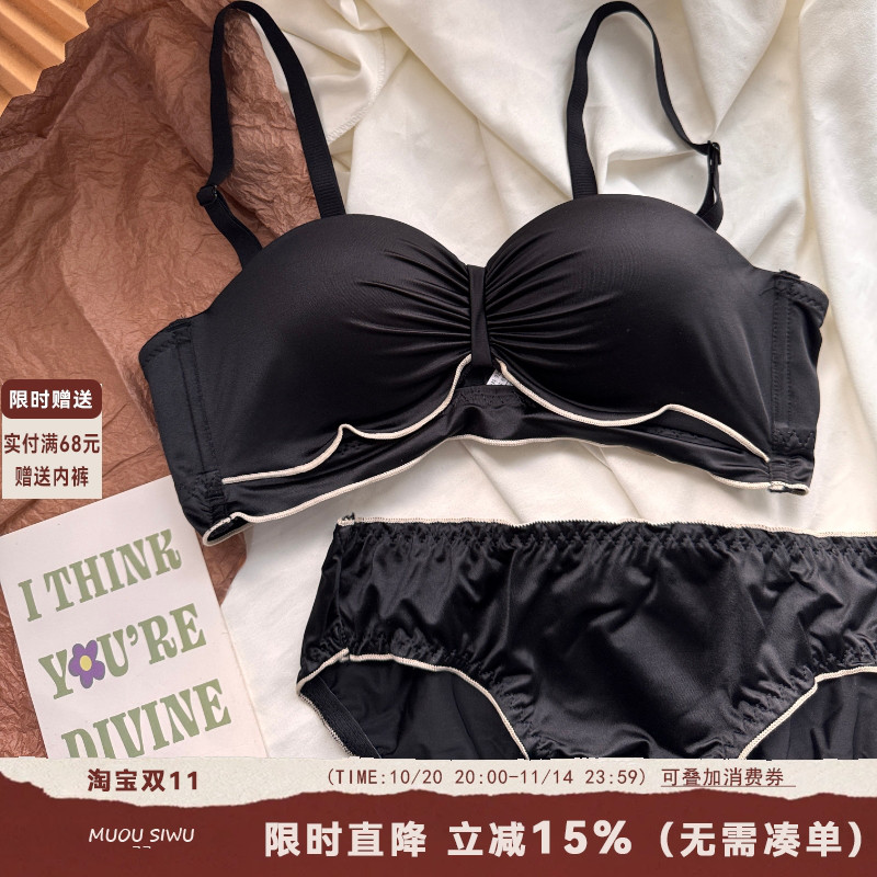 黑色无痕缎面内衣女小胸聚拢无钢圈防下垂性感纯欲风美背文胸套装