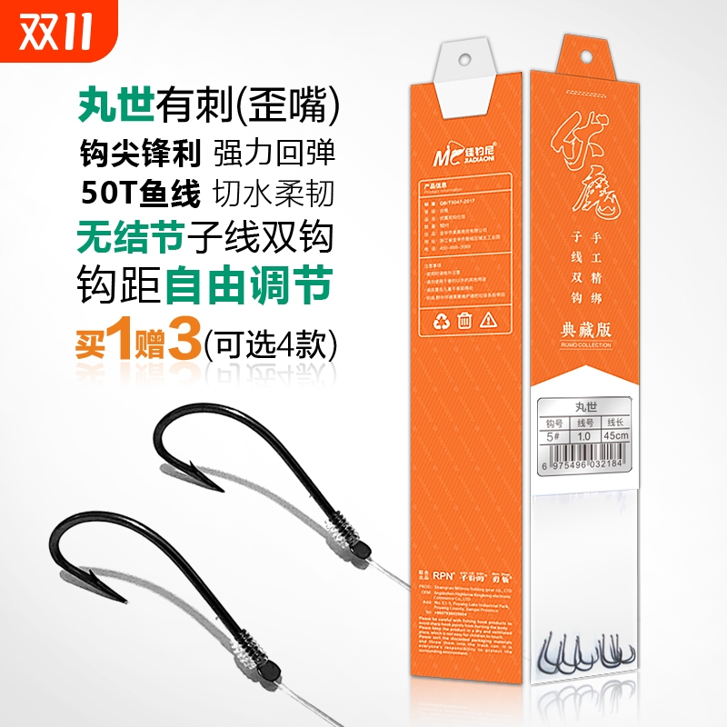 丸世鱼钩正品子线双钩绑好长柄有倒刺鱼钩鱼线组合超硬锋利钓鱼钩