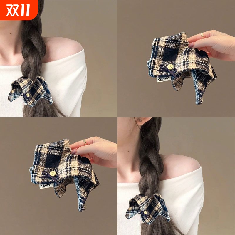 晚秋之枫新潮秋冬格纹撞色方巾发圈时尚纽扣蝴蝶结复古发饰头绳