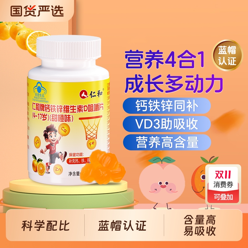 仁和钙铁锌维生素D咀嚼片钙片儿童青少年补钙免疫力长高正品官方