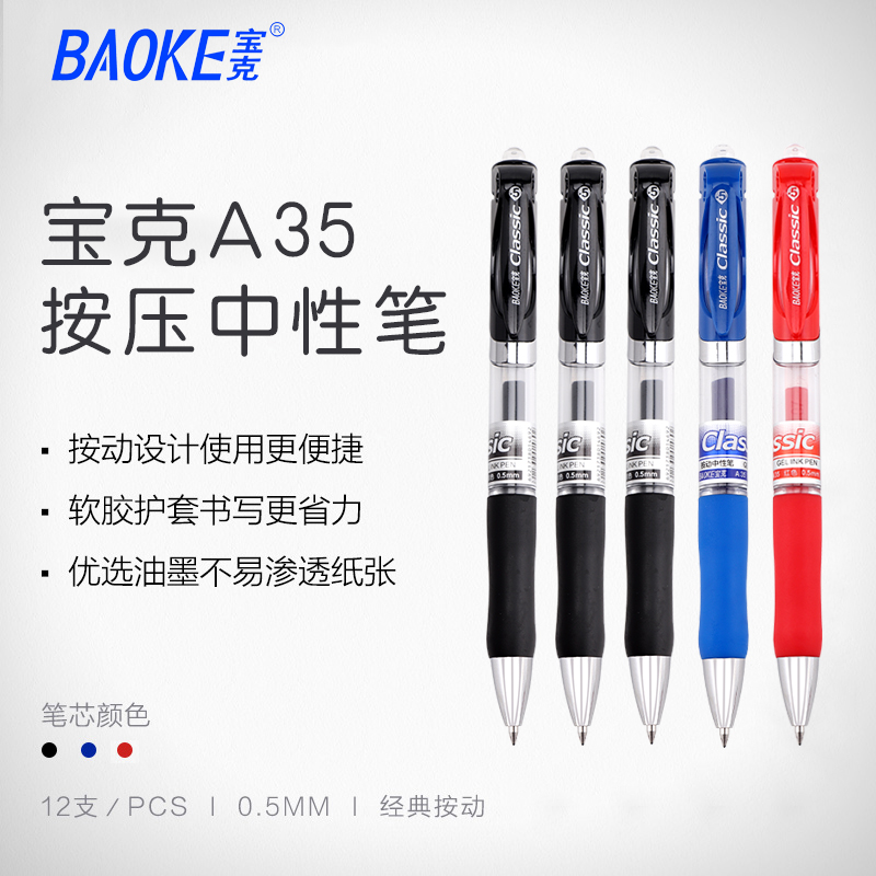 宝克按压式中性笔0.5mm子弹头黑色红蓝签字笔办公笔按动水笔简约