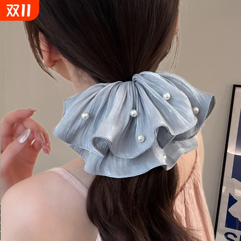 2025春季新款高级感流光丝滑锻面褶皱珍珠大肠发圈高端大号发饰女