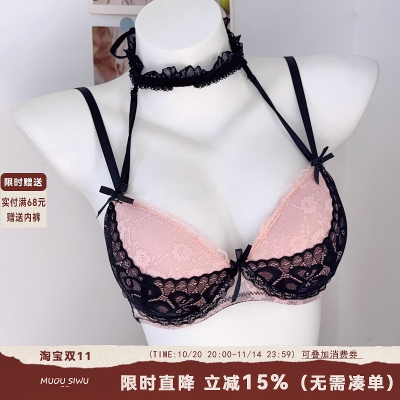 诱惑女郎 夏季薄款内衣女性感蕾丝挂脖小胸聚拢显大美背文胸套装