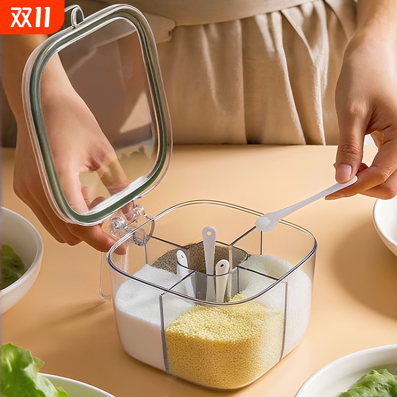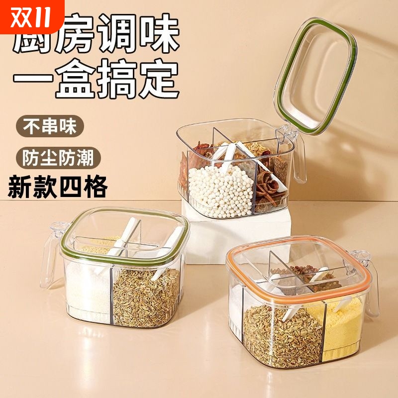 厨房家用调料盐罐透明密封防潮一体多格带勺味精胡椒调味收纳盒