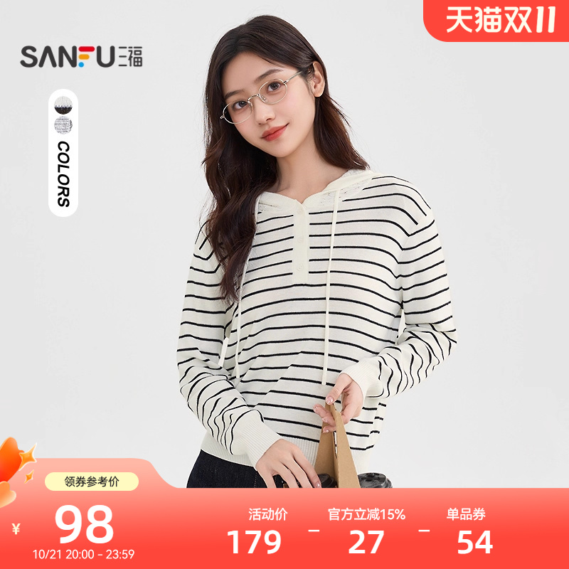 三福套头毛衣2025新款秋季简约韩系条纹带帽小个子上衣女装507