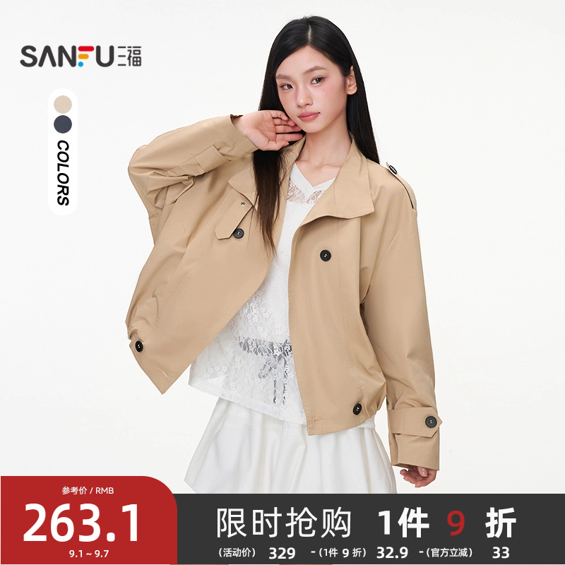 三福短款风衣女2025新款秋季小个子系扣双排扣宽松外套女装507