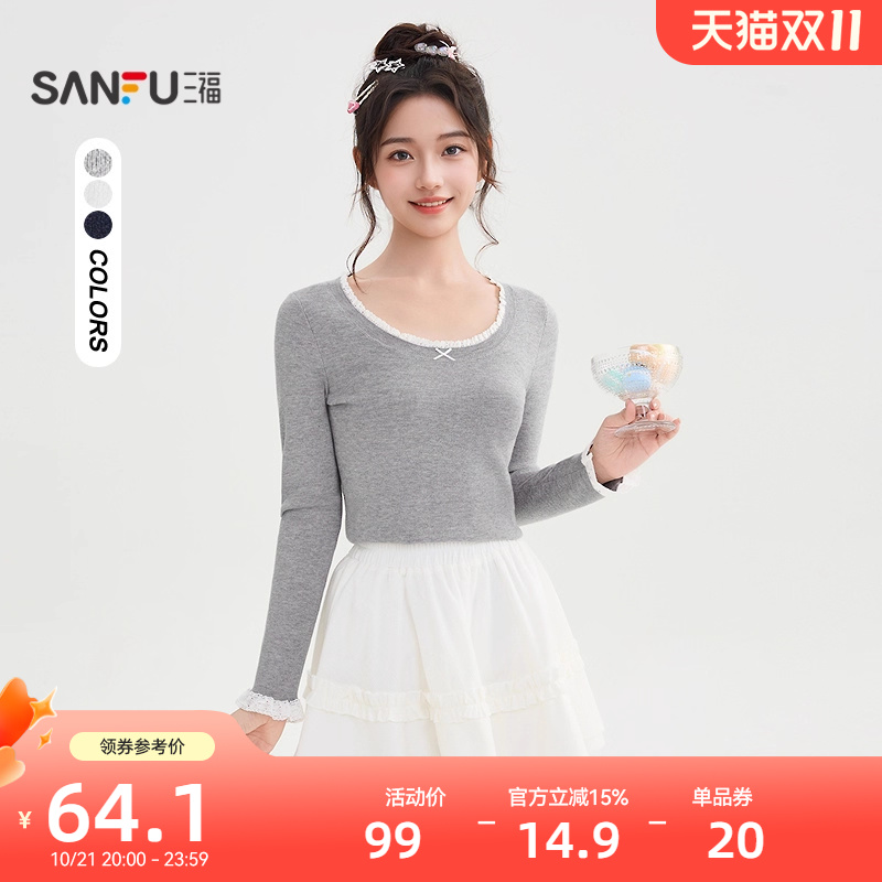 #三福打底毛衫2025冬季蕾丝花边蝴蝶结修身内搭上衣女装5054