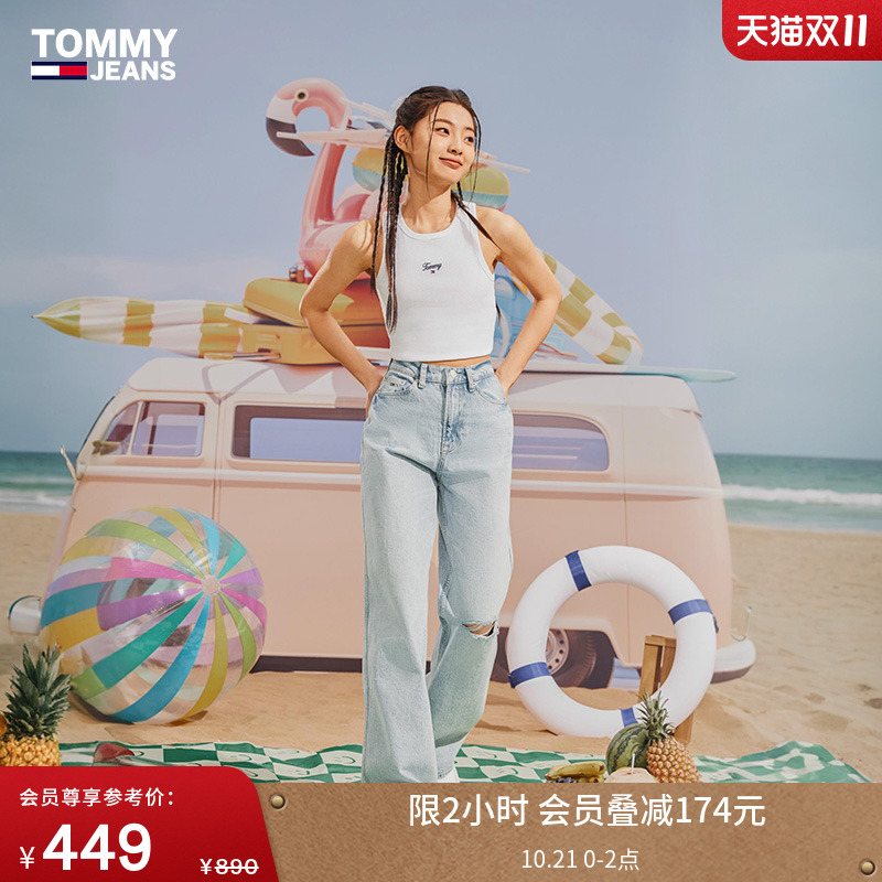 Tommy女装破洞中腰阔腿牛仔裤