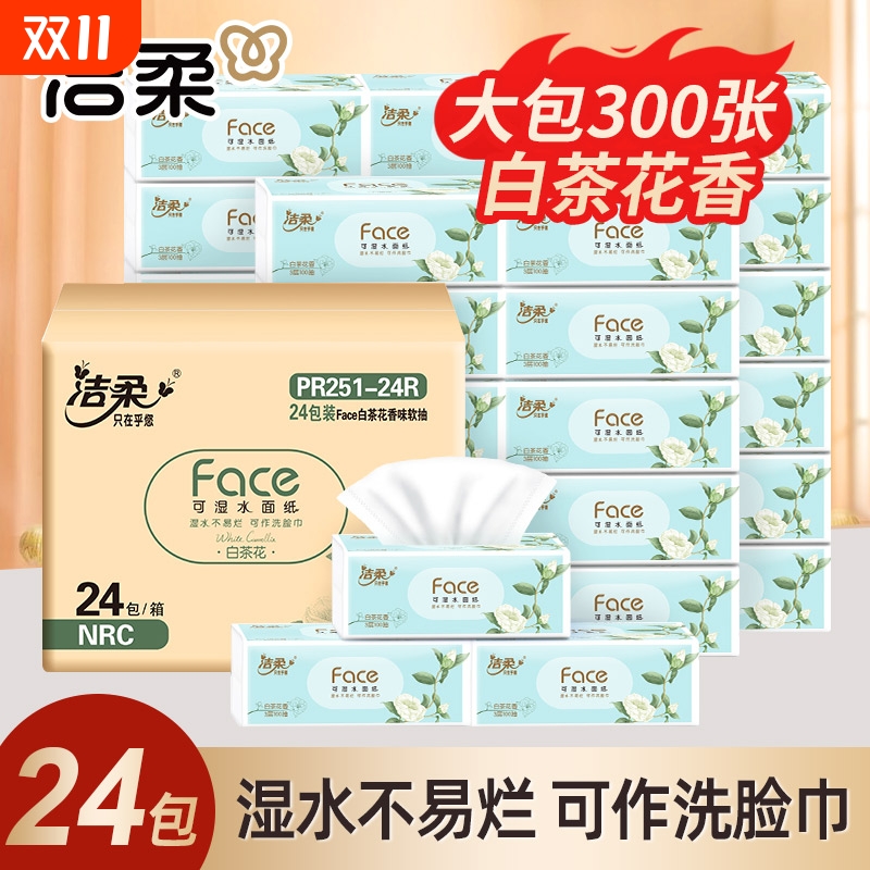 洁柔家用木浆白茶纸巾花香抽纸3层M码100抽大包可湿水餐巾面巾纸